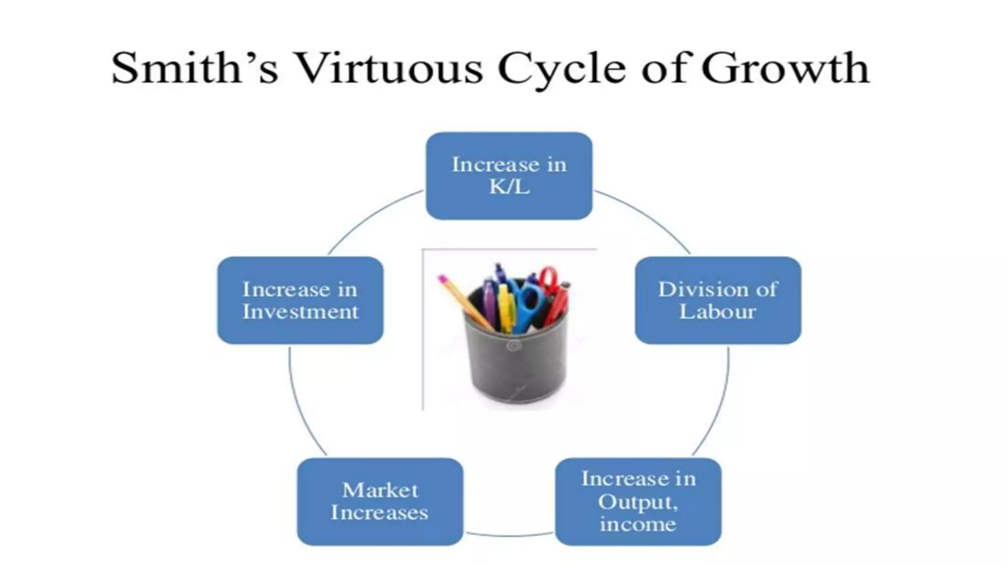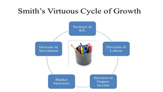 4) John Stuart Mill viewed economic development as dependent on land, labor, and capital, and distinguished between productive and unproductive consumption.