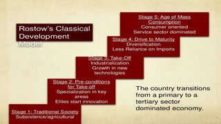 3) Walt Rostow proposed a model of economic growth occurring in five stages: traditional society, preconditions for take-off, take-off, drive to maturity, and high mass consumption.