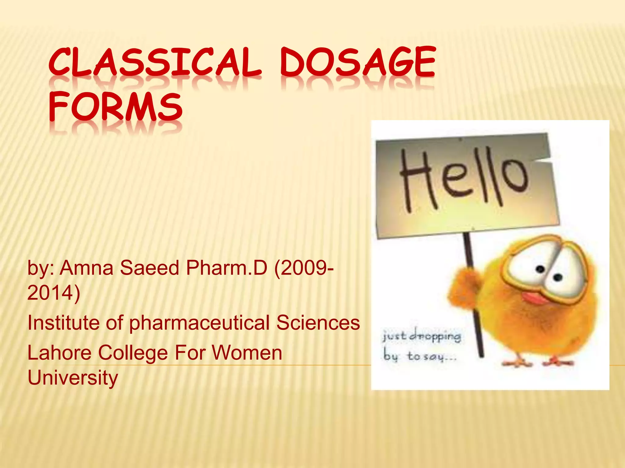 This document discusses classical dosage forms, which are conventional dosage forms prepared without advanced techniques. It describes lozenges as medicated candies dissolved in the mouth to soothe throat irritation. Pills are small, round solids containing medication. Cachets enclose medication within a wafer shell. Draughts are single-dose liquid preparations packaged in larger volumes. Suppositories and pessaries are solid medications inserted into orifices to exert local or systemic effects as they dissolve.