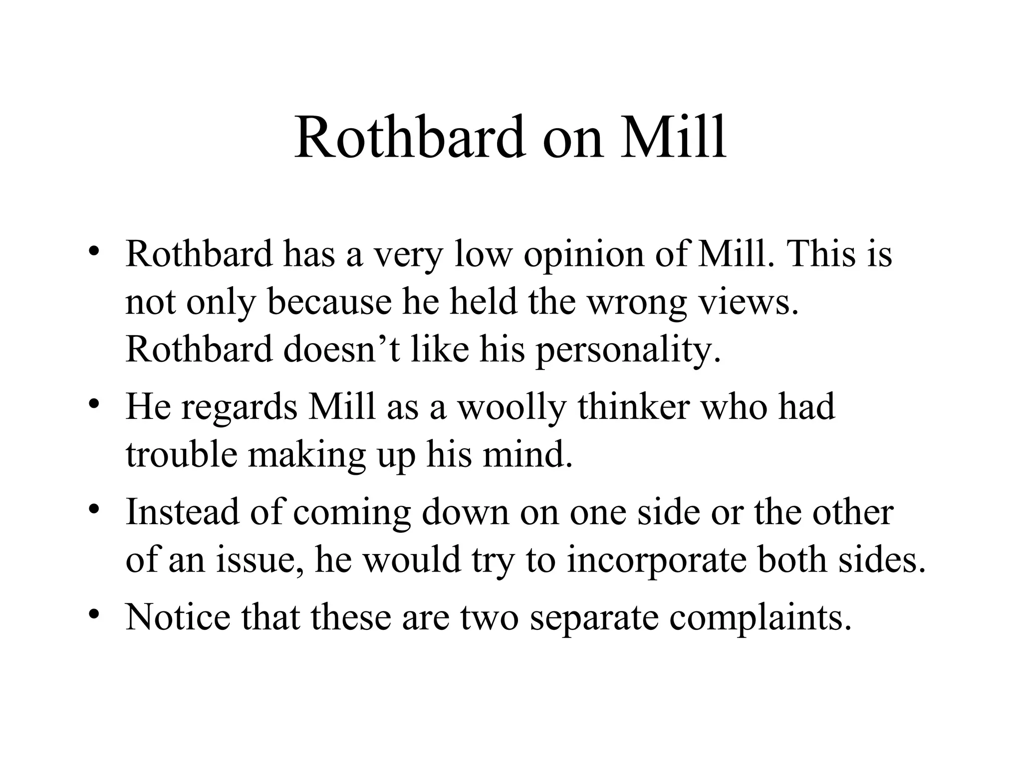 The document discusses Rothbard's critical views on John Stuart Mill, portraying him as a vacillating thinker who incorporated contradictory ideas into his philosophy. It contrasts Mill with his father, James Mill, highlighting key differences in their economic theories and discussing Mill's attempts to revive Ricardian economics while adding his own modifications. Additionally, it addresses Mill's views on population control, imperialism, socialism, and liberty, suggesting that he may have favored the direction of society by a select intellectual class rather than promoting true freedom for the masses.