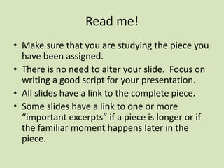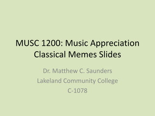 This document provides instructions and information for students presenting on classical music memes for a Music Appreciation class. It explains that students should write a script and cite sources for their 1 minute presentation on an assigned musical piece, which will include playing a 1 minute excerpt and talking about the composer and composition. The document then provides 30 classical music memes with the composer, composition, a link to the full piece, and in some cases a link to an important excerpt.