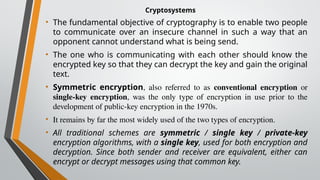 #12 In this section and the next, we examine a sampling of what might be called classical encryption techniques. A study of these techniques enables us to illustrate the basic approaches to symmetric encryption used today and the types of cryptanalytic attacks that must be anticipated. The two basic building blocks of all encryption technique are substitution and transposition. We examine these in the next two sections. Finally, we discuss a system that combine both substitution and transposition.