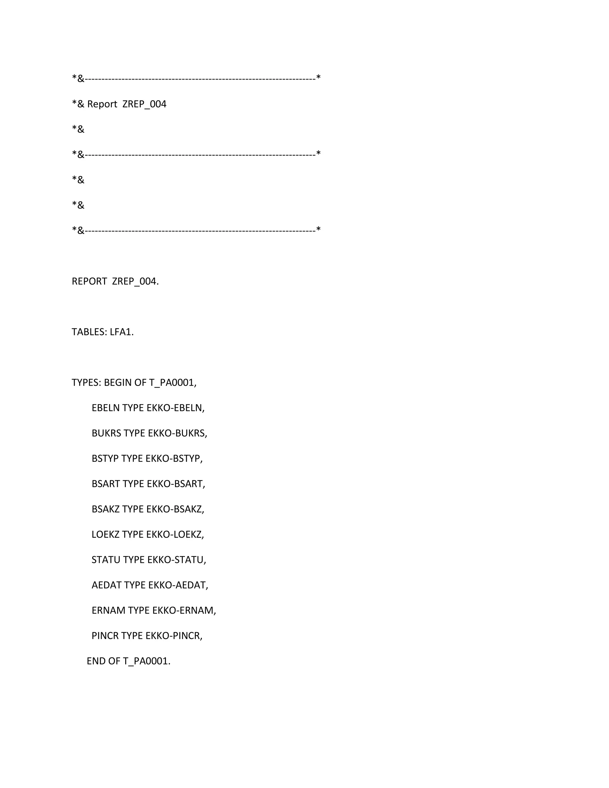 This document contains the code for a SAP report. It defines data types, tables, and internal tables. It also contains code for the selection screen including radio buttons, check boxes, and list boxes. The selection screen code dynamically sets the active property of the check boxes based on which radio button is selected.