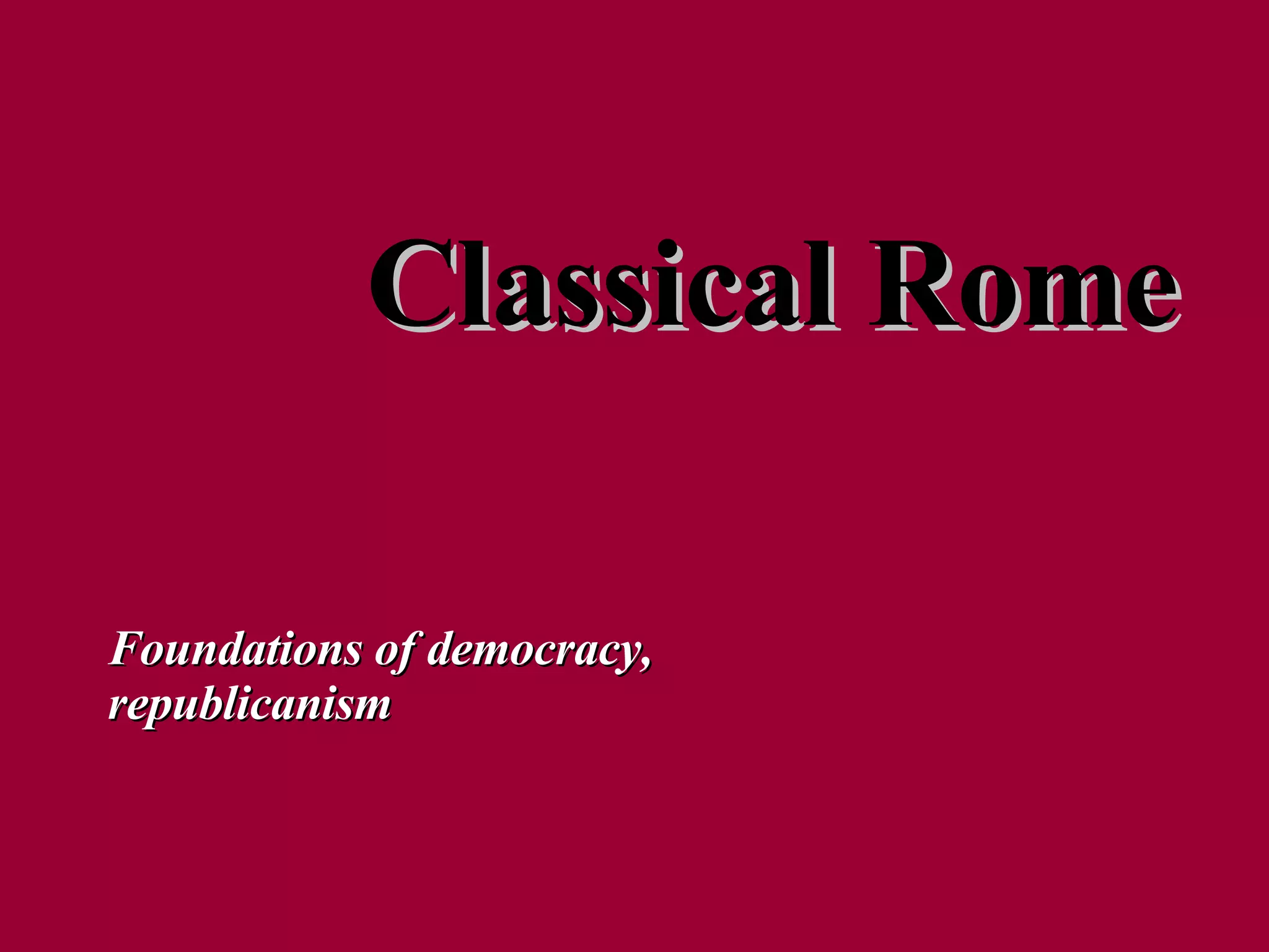 The document provides background information on classical Rome and its foundations in democracy and republicanism. It describes the founding of Rome by Romulus and Remus, and the establishment of the Roman Republic around 509 BCE. It discusses the Second Punic War between Rome and Carthage and Hannibal's famous crossing of the Alps into Italy with war elephants. It also summarizes Rome's eventual defeat of Carthage and outlines some key events and figures in Roman history like Julius Caesar, the Roman Empire, and factors in the fall of Rome to Germanic tribes.