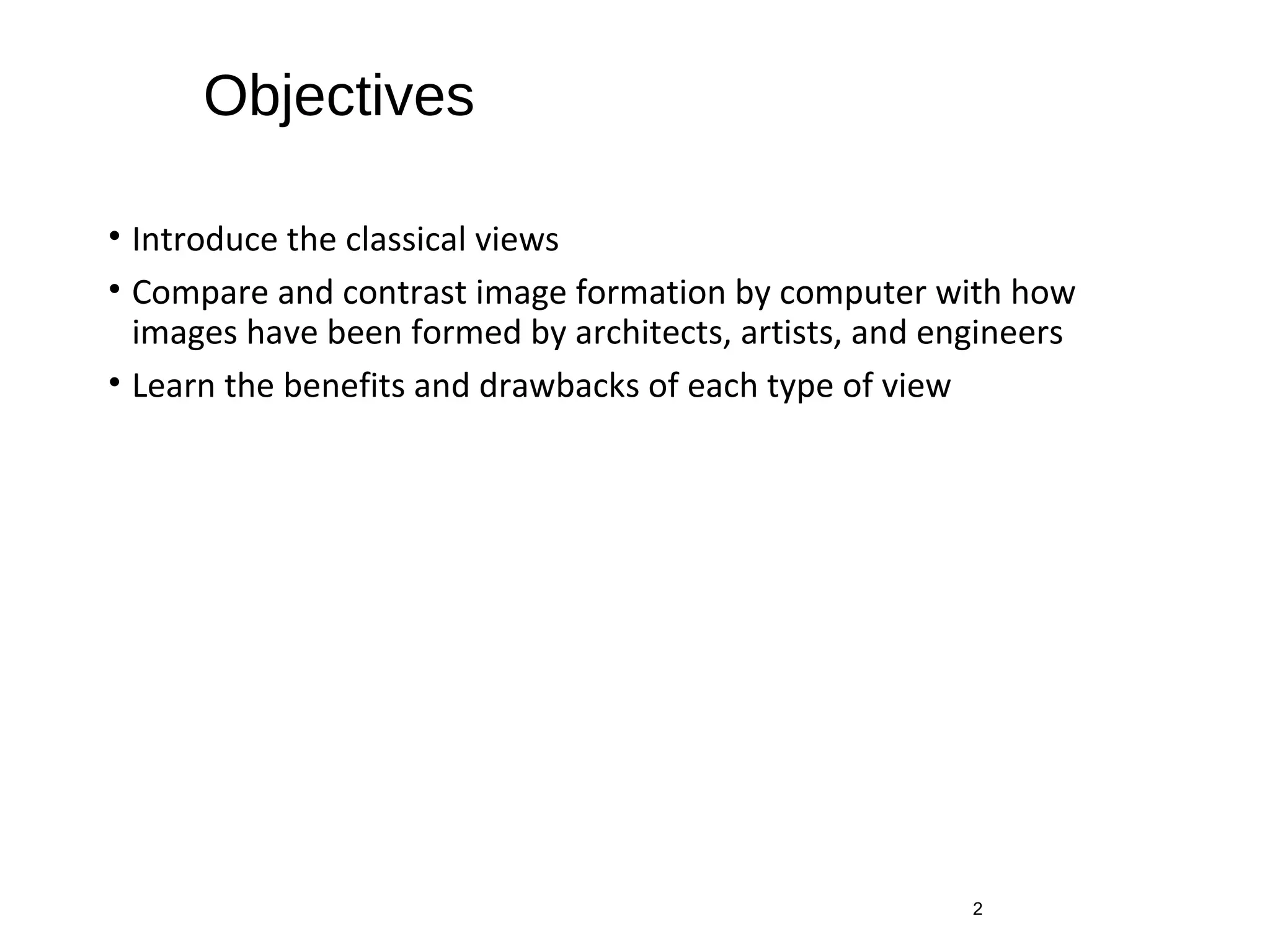Classical views involve projecting 3D objects onto a 2D surface using projectors from the object to the viewer. There are two main types of projections: parallel projections which preserve distances but not angles, and perspective projections which preserve angles in planes parallel to the projection plane. Perspective projection uses a center of projection and vanishing points, while parallel projections include orthographic, axonometric like isometric/dimetric/trimetric, and oblique views. Each type has advantages and disadvantages for visualization and measurement.