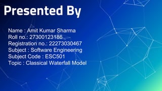 The document provides an overview of the classical waterfall model in software engineering, which is a linear and sequential approach characterized by distinct phases including requirement analysis, system design, implementation, integration and testing, deployment, and maintenance. Originating in 1970, it was introduced by Winston W. Royce and is best suited for projects with well-defined and stable requirements. The model emphasizes thorough documentation and structured processes, making it useful for comparing traditional and modern software development methodologies.