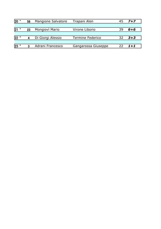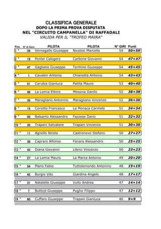 La classifica generale della prima prova del 'circuito campanella' a Raffadali per il 'trofeo maira' mostra Giuseppe Vernagallo e Marcello Nicolosi al primo posto con 54 giri e 100 punti. Calogero Pontei e Giovanni Carbone si piazzano secondi, seguiti da Giuseppe Gagliano e Giuseppe Termine al terzo posto. I punti variabili premiati per le posizioni rimanenti indicano massima competitività tra i partecipanti.