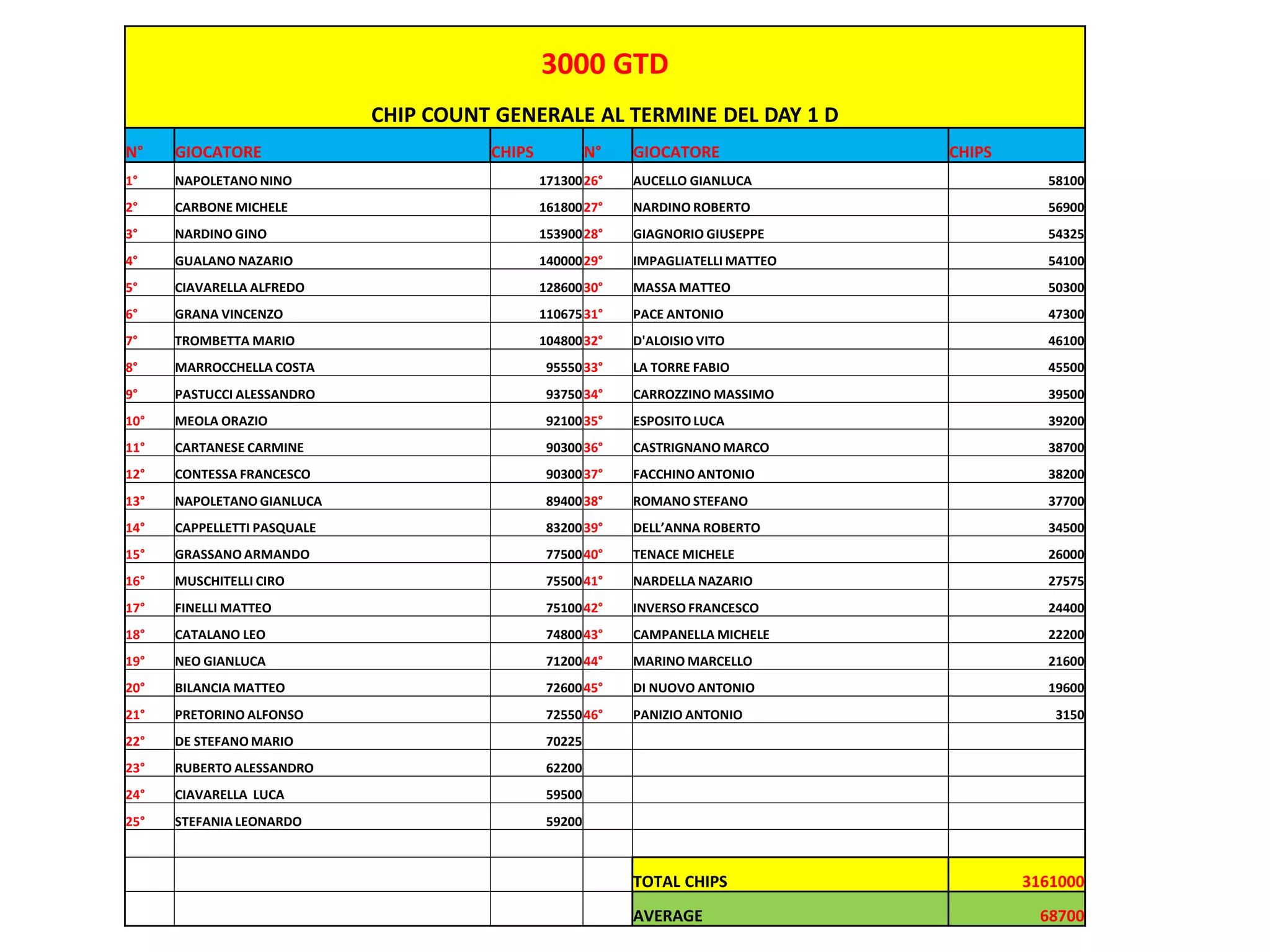 Il documento riporta il conteggio generale delle chip al termine del giorno 1 di un torneo, con dettagli sulle posizioni e le chip accumulate da ciascun giocatore. Il totale delle chip è di 3.161.000, con una media di 68.700 chip per giocatore. I primi cinque giocatori in classifica sono Napoletano Nino, Carbone Michele, Nardino Gino, Gualano Nazario e Ciavarella Alfredo.