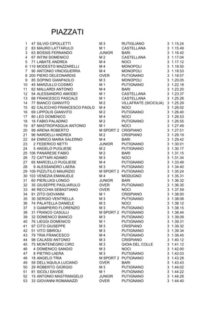 47 SILVIO CIPOLLETTI M3 RUTIGLIANO 3 1.15.24 2 83 MAURO LATTARULO M1 CASTELLANA 3 1.15.49 3 63 BOSSIS FERNANDO JUNIOR BARI 3 1.16.42 4 67 INTINI DOMENICO M2 CASTELLANA 3 1.17.04 5 71 LABATE ANDREA M4 NOCI 3 1.17.12 6 110 MODESTO MAZZARELLI M4 MONOPOLI 3 1.18.50 7 90 ANTONIO VINCIGUERRA M4 MONOPOLI 3 1.18.53 8 200 PIERO DELEONARDIS OVER PUTIGNANO 3 1.18.57 9 85 SOPINO GIANPAOLO M3 MONOPOLI 3 1.20.05 10 45 MARZULLO COSIMO M1 PUTIGNANO 3 1.22.18 11 62 MALLARDI ANTONIO M4 BARI 3 1.23.20 12 54 ALESSANDRO AMODEI M1 CASTELLANA 3 1.23.37 13 68 FRANCESCO PASCALE M1 CASTELLANA 3 1.25.28 14 77 BIANCO GIANVITO M2 VILLAFRATE (SICICILIA) 3 1.25.29 15 82 CALICCHIO FRANCESCO PAOLO M4 NOCI 3 1.26.02 16 69 LIPPOLIS GIANVITO M2 PUTIGNANO 3 1.26.40 17 80 LEO DOMENICO M4 NOCI 3 1.26.53 18 16 FABIO PALADINO M2 PUTIGNANO 3 1.26.55 19 87 MASTROPASQUA ANTONIO M1 NOCI 3 1.27.49 20 99 ARENA ROBERTO M SPORT 2 CRISPIANO 3 1.27.51 21 96 NARDELLI ANDREA M2 CRISPIANO 3 1.29.19 22 64 ENRICO MARIA SALERNO M4 BARI 3 1.29.42 23 2 FEDERICO NETTI JUNIOR PUTIGNANO 3 1.30.01 24 5 ANGELO PUGLIESE M2 PUTIGNANO 3 1.30.17 25 106 PANARESE FABIO M2 BARI 3 1.31.15 26 72 CATTARI ADAMO M3 NOCI 3 1.31.34 27 65 MARCELLO PUGLIESE M4 PUTIGNANO 3 1.33.49 28 9 ALESSANDRO LAERA M3 PUTIGNANO 3 1.34.40 29 109 PIZZUTILO MAURIZIO M SPORT 2 PUTIGNANO 3 1.35.24 30 103 VENEZIA EMANUELE M4 MODUGNO 3 1.35.31 31 60 PIERLUIGI LONGO JUNIOR BARI 3 1.36.32 32 35 GIUSEPPE PAGLIARULO OVER PUTIGNANO 3 1.36.35 33 46 RECCHIA SEBASTIANO OVER NOCI 3 1.37.59 34 91 ZITO GIOVANNI M1 CRISPIANO 3 1.38.00 35 30 SERGIO VENTRELLA M3 PUTIGNANO 3 1.38.08 36 74 PALATELLA DANIELE M3 NOCI 3 1.38.12 37 3 GIAMPIERO FLORENZIO M3 PUTIGNANO 3 1.38.15 38 31 FRANCO CASULLI M SPORT 2 PUTIGNANO 3 1.38.44 39 32 DOMENICO BIANCO M3 PUTIGNANO 3 1.39.09 40 76 LIEGGI DOMENICO M1 PUTIGNANO 3 1.39.31 41 97 CITO GIUSEPPE M3 CRISPIANO 3 1.39.32 42 51 VITO SBIROLI M3 PUTIGNANO 3 1.39.34 43 79 TRIA FRANCESCO M4 PUTIGNANO 3 1.39.45 44 98 CALASSI ANTONIO M3 CRISPIANO 3 1.40.12 45 75 MONTENEGRO CIRO M3 GIOIA DEL COLLE 3 1.41.12 46 4 DOMENICO SANGIO M3 NOCI 3 1.42.00 47 8 PIETRO LAERA M3 PUTIGNANO 3 1.42.03 48 18 ANGELO TRIA M SPORT 2 PUTIGNANO 3 1.43.28 49 59 DELL'AQUILA LUCIANO OVER BARI 3 1.43.43 50 29 ROBERTO GIORGIO M3 PUTIGNANO 3 1.44.02 51 81 SICOLI DAVIDE M1 PUTIGNANO 3 1.44.22 52 15 ANTONIO MASTRANGELO JUNIOR PUTIGNANO 3 1.44.28 53 33 GIOVANNI ROMANAZZI OVER PUTIGNANO 3 1.44.40