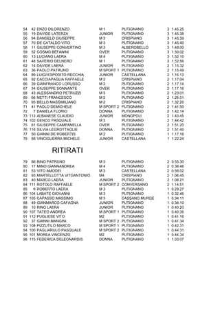 DILORENZO M1 PUTIGNANO 3 1.45.25 55 19 DAVIDE LATERZA JUNIOR PUTIGNANO 3 1.45.38 56 94 DANGELO GIUSEPPE M3 CRISPIANO 3 1.45.39 57 70 DE CATALDO VITO M3 PUTIGNANO 3 1.45.40 58 11 GIUSEPPE CONVERTINO M3 ALBEROBELLO 3 1.48.00 59 52 COSMO BEFANINI OVER PUTIGNANO 3 1.50.02 60 13 LUCIANO LAERA M4 PUTIGNANO 3 1.52.10 61 48 SAVERIO DELNERO M1 PUTIGNANO 3 1.52.56 62 14 DAVIDE LAERA JUNIOR PUTIGNANO 2 1.15.32 63 36 PAOLO PATRUNO M SPORT 1 PUTIGNANO 2 1.15.49 64 89 LUIGI ESPOSITO RECCHIA JUNIOR CASTELLANA 2 1.16.13 65 92 CACCIAPAGLIA RAFFAELE M2 CRISPIANO 2 1.17.04 66 39 GIANFRANCO LORUSSO M2 PUTIGNANO 2 1.17.14 67 34 GIUSEPPE SONNANTE OVER PUTIGNANO 2 1.17.16 68 43 ALESSANDRO PETRUZZI M3 PUTIGNANO 2 1.23.01 69 66 NETTI FRANCESCO M2 PUTIGNANO 2 1.26.51 70 95 BELLO MASSIMILIANO M2 CRISPIANO 2 1.32.20 71 41 PAOLO DEMICHELE M SPORT 2 PUTIGNANO 2 1.41.50 72 7 DANIELA FLORIO DONNA PUTIGNANO 2 1.42.14 73 113 ALBANESE CLAUDIO JUNIOR MONOPOLI 2 1.43.45 74 102 GENCO PASQUALE M3 PUTIGNANO 2 1.44.42 75 61 GIUSEPPE CAMPANELLA OVER PUTIGNANO 2 1.51.20 76 116 SILVIA LEGROTTAGLIE DONNA PUTIGNANO 2 1.51.40 77 50 GIANNI DE ROBERTIS M2 PUTIGNANO 1 1.17.16 78 88 VINCIGUERRA MICHELE JUNIOR CASTELLANA 1 1.22.24 RITIRATI 79 86 BINO PATRUNO M3 PUTIGNANO 2 0.55.30 80 17 MINO GIANNANDREA M4 PUTIGNANO 2 0.38.46 81 53 VITO AMODEI M3 CASTELLANA 2 0.56.02 82 93 MARTELLOTTA VITOANTONIO M4 CRISPIANO 2 1.06.45 83 40 MARCO LAERA JUNIOR PUTIGNANO 2 1.08.21 84 111 ROTOLO RAFFAELE M SPORT 2 CONVERSANO 2 1.14.51 85 6 ROBERTO LAERA M3 PUTIGNANO 1 0.29.27 86 104 LABATE GIOVANNI M3 PUTIGNANO 1 0.32.46 87 105 CAPASSO MASSIMO M3 CASSANO MURGE 1 0.34.11 88 49 GIANMARCO CAFAGNA JUNIOR PUTIGNANO 1 0.38.10 89 10 RINO LAERA JUNIOR PUTIGNANO 1 0.40.20 90 107 TATEO ANDREA M SPORT 1 PUTIGNANO 1 0.40.35 91 112 PUGLIESE VITO M2 PUTIGNANO 1 0.41.16 92 37 GIANNI MANGINI M SPORT 2 PUTIGNANO 1 0.41.34 93 108 PIZZUTILO MARCO M SPORT 1 PUTIGNANO 1 0.42.31 94 100 PAGLIARULO PASQUALE M SPORT 2 PUTIGNANO 1 0.44.31 95 101 MOREA VINCENZO M2 PUTIGNANO 1 0.44.34 96 115 FEDERICA DELEONARDIS DONNA PUTIGNANO 1 1.03.07