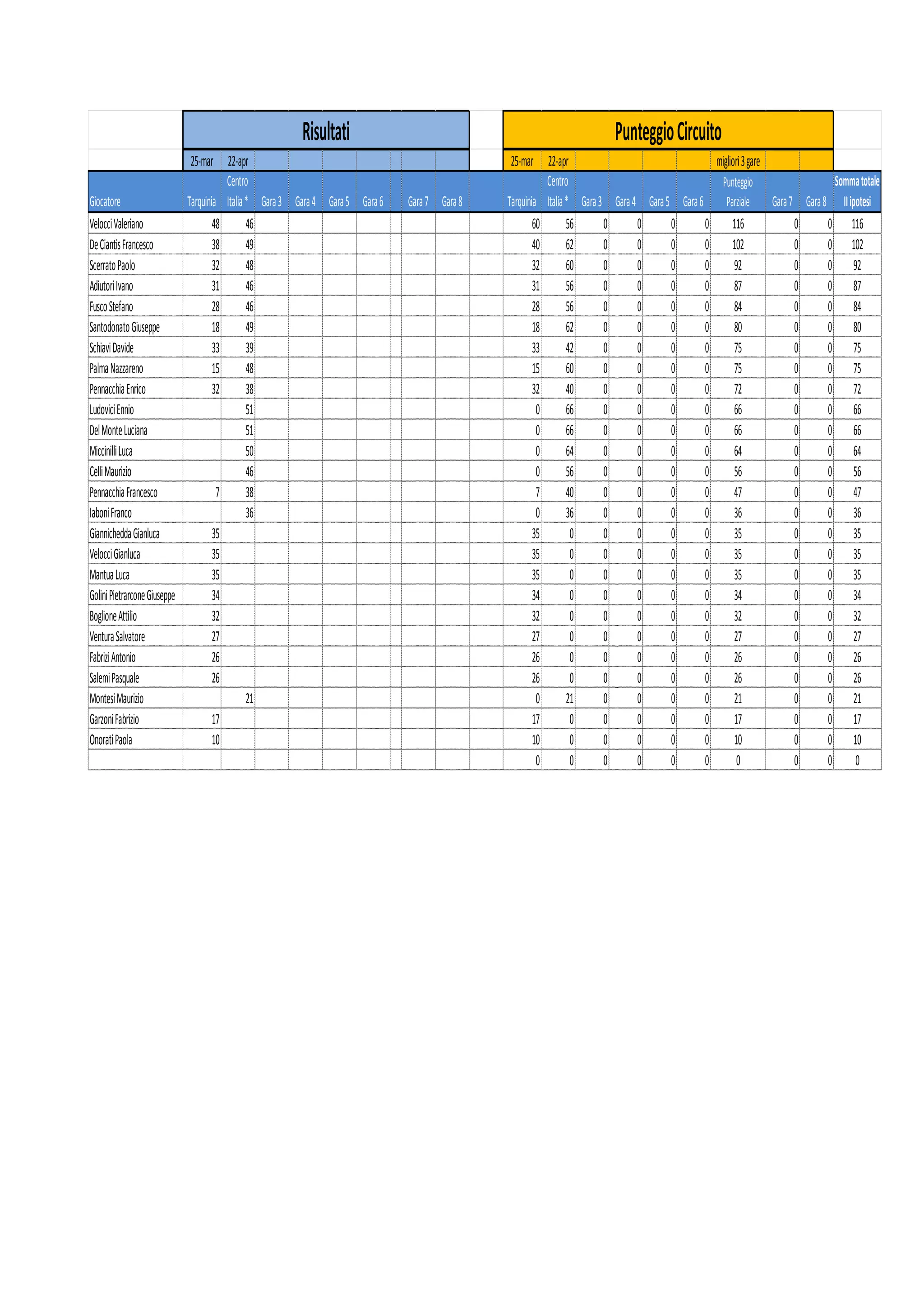Il documento riporta i punteggi delle gare di vari giocatori nel circuito di Tarquinia tra il 25 marzo e il 22 aprile. I risultati presentano le somma totali per ogni giocatore in diverse competizioni. I punteggi più alti sono stati ottenuti da Velocci Valeriano (116), De Ciantis Francesco (102) e Scerrato Paolo (92).