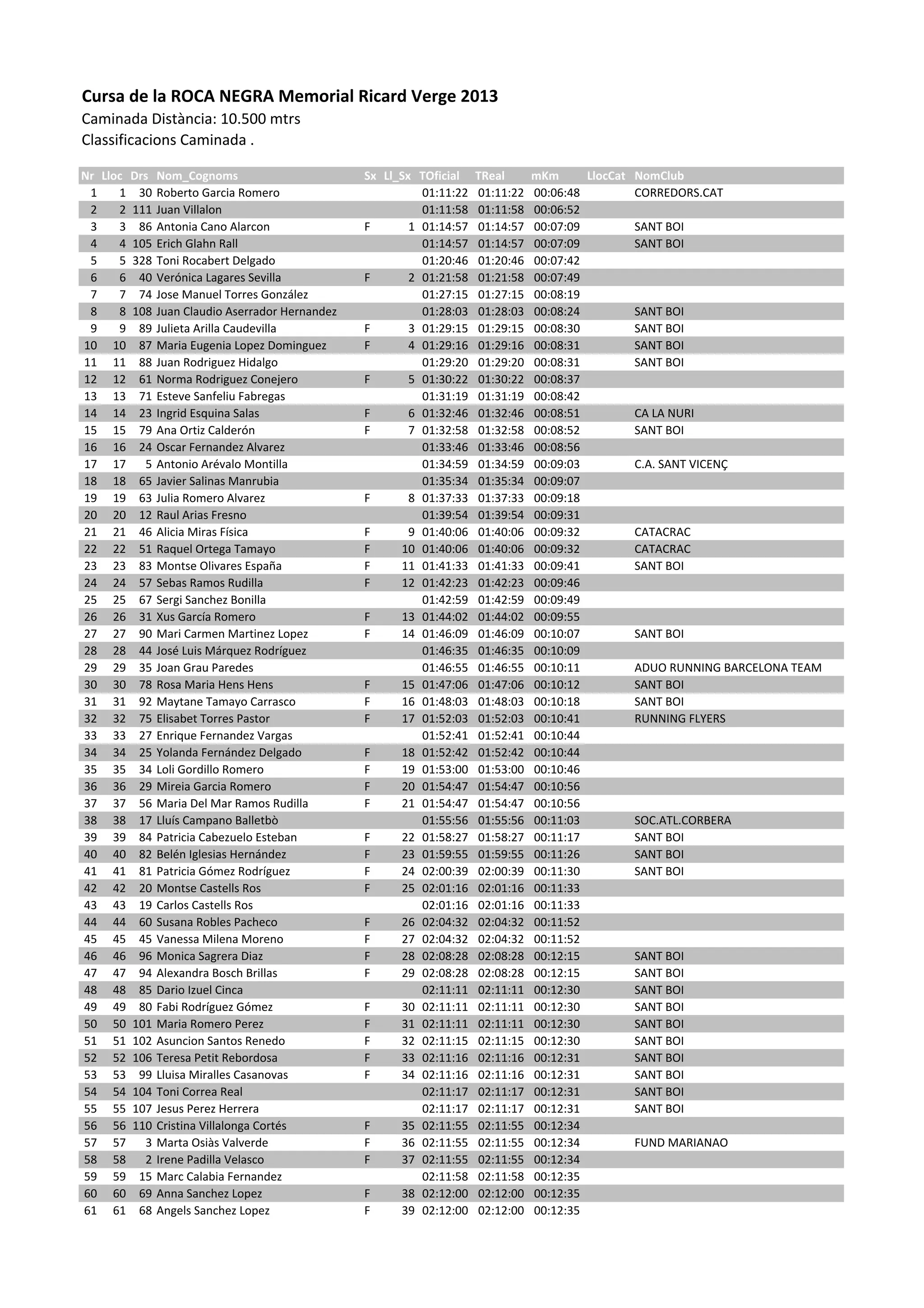 This document provides the results from the 10.5 km Cursa de la ROCA NEGRA Memorial Ricard Verge 2013 running race. It lists the top 100 finishers, providing their ranking, name, gender (for women), time to complete the course, average pace, and club affiliation. The winner, Roberto Garcia Romero, finished in 1 hour, 11 minutes and 22 seconds.