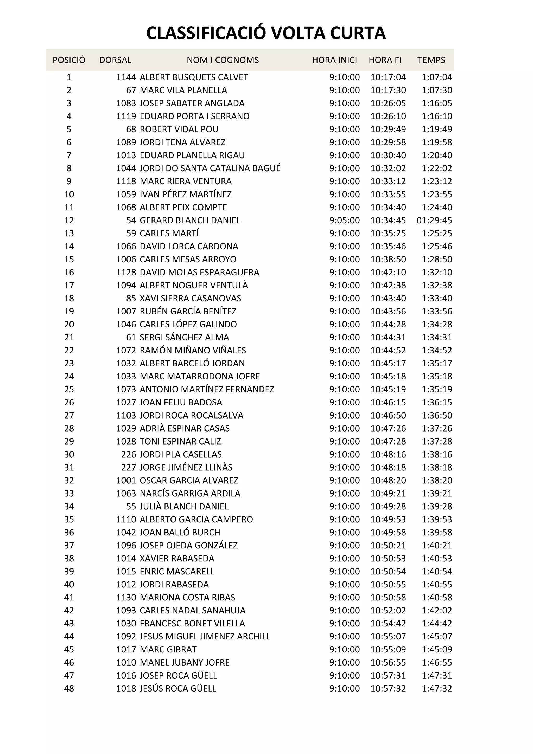 DORSAL NOM I COGNOMS HORA INICI HORA FI TEMPS 1 1144 ALBERT BUSQUETS CALVET 9:10:00 10:17:04 1:07:04 2 67 MARC VILA PLANELLA 9:10:00 10:17:30 1:07:30 3 1083 JOSEP SABATER ANGLADA 9:10:00 10:26:05 1:16:05 4 1119 EDUARD PORTA I SERRANO 9:10:00 10:26:10 1:16:10 5 68 ROBERT VIDAL POU 9:10:00 10:29:49 1:19:49 6 1089 JORDI TENA ALVAREZ 9:10:00 10:29:58 1:19:58 7 1013 EDUARD PLANELLA RIGAU 9:10:00 10:30:40 1:20:40 8 1044 JORDI DO SANTA CATALINA BAGUÉ 9:10:00 10:32:02 1:22:02 9 1118 MARC RIERA VENTURA 9:10:00 10:33:12 1:23:12 10 1059 IVAN PÉREZ MARTÍNEZ 9:10:00 10:33:55 1:23:55 11 1068 ALBERT PEIX COMPTE 9:10:00 10:34:40 1:24:40 12 54 GERARD BLANCH DANIEL 9:05:00 10:34:45 01:29:45 13 59 CARLES MARTÍ 9:10:00 10:35:25 1:25:25 14 1066 DAVID LORCA CARDONA 9:10:00 10:35:46 1:25:46 15 1006 CARLES MESAS ARROYO 9:10:00 10:38:50 1:28:50 16 1128 DAVID MOLAS ESPARAGUERA 9:10:00 10:42:10 1:32:10 17 1094 ALBERT NOGUER VENTULÀ 9:10:00 10:42:38 1:32:38 18 85 XAVI SIERRA CASANOVAS 9:10:00 10:43:40 1:33:40 19 1007 RUBÉN GARCÍA BENÍTEZ 9:10:00 10:43:56 1:33:56 20 1046 CARLES LÓPEZ GALINDO 9:10:00 10:44:28 1:34:28 21 61 SERGI SÁNCHEZ ALMA 9:10:00 10:44:31 1:34:31 22 1072 RAMÓN MIÑANO VIÑALES 9:10:00 10:44:52 1:34:52 23 1032 ALBERT BARCELÓ JORDAN 9:10:00 10:45:17 1:35:17 24 1033 MARC MATARRODONA JOFRE 9:10:00 10:45:18 1:35:18 25 1073 ANTONIO MARTÍNEZ FERNANDEZ 9:10:00 10:45:19 1:35:19 26 1027 JOAN FELIU BADOSA 9:10:00 10:46:15 1:36:15 27 1103 JORDI ROCA ROCALSALVA 9:10:00 10:46:50 1:36:50 28 1029 ADRIÀ ESPINAR CASAS 9:10:00 10:47:26 1:37:26 29 1028 TONI ESPINAR CALIZ 9:10:00 10:47:28 1:37:28 30 226 JORDI PLA CASELLAS 9:10:00 10:48:16 1:38:16 31 227 JORGE JIMÉNEZ LLINÀS 9:10:00 10:48:18 1:38:18 32 1001 OSCAR GARCIA ALVAREZ 9:10:00 10:48:20 1:38:20 33 1063 NARCÍS GARRIGA ARDILA 9:10:00 10:49:21 1:39:21 34 55 JULIÀ BLANCH DANIEL 9:10:00 10:49:28 1:39:28 35 1110 ALBERTO GARCIA CAMPERO 9:10:00 10:49:53 1:39:53 36 1042 JOAN BALLÓ BURCH 9:10:00 10:49:58 1:39:58 37 1096 JOSEP OJEDA GONZÁLEZ 9:10:00 10:50:21 1:40:21 38 1014 XAVIER RABASEDA 9:10:00 10:50:53 1:40:53 39 1015 ENRIC MASCARELL 9:10:00 10:50:54 1:40:54 40 1012 JORDI RABASEDA 9:10:00 10:50:55 1:40:55 41 1130 MARIONA COSTA RIBAS 9:10:00 10:50:58 1:40:58 42 1093 CARLES NADAL SANAHUJA 9:10:00 10:52:02 1:42:02 43 1030 FRANCESC BONET VILELLA 9:10:00 10:54:42 1:44:42 44 1092 JESUS MIGUEL JIMENEZ ARCHILL 9:10:00 10:55:07 1:45:07 45 1017 MARC GIBRAT 9:10:00 10:55:09 1:45:09 46 1010 MANEL JUBANY JOFRE 9:10:00 10:56:55 1:46:55 47 1016 JOSEP ROCA GÜELL 9:10:00 10:57:31 1:47:31 48 1018 JESÚS ROCA GÜELL 9:10:00 10:57:32 1:47:32