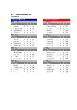 The document summarizes the standings of the 2013 NFL regular season. In the NFC East, the Dallas Cowboys and Philadelphia Eagles had the best records of 5-5. In the NFC North, the Detroit Lions led with a 6-3 record. The New Orleans Saints topped the NFC South at 7-2. And the Seattle Seahawks dominated the NFC West going 9-1. In the AFC, the New England Patriots led the East at 7-2. The Cincinnati Bengals were first in the North at 6-4. The Indianapolis Colts had the best mark in the South at 6-3. And the Kansas City Chiefs went 9-0 to take the West.