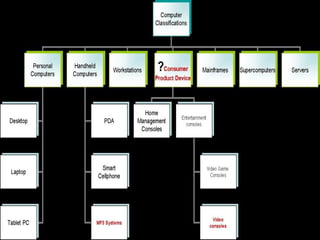 There are several types of computers that can be classified based on their size, power, and purpose. Digital computers operate using binary digits and are used for most modern applications. Analog computers use continuous variables while digital computers use discrete binary values. Hybrid computers combine both analog and digital components. Personal computers are designed for individual use and come in desktop and laptop models. Larger and more powerful computers include servers, workstations, minicomputers, mainframes, and supercomputers, which are used for specialized applications requiring processing of large amounts of data or high-speed calculations. The latest development is wearable computers integrated into devices worn on the body.