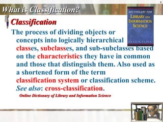 Classification is the method of organizing information into hierarchical systems based on shared characteristics to improve access and retrieval. The Dewey Decimal Classification (DDC) and Library of Congress Classification (LCC) are two primary systems used in libraries, with DDC being prevalent in public libraries and LCC in academic settings. Additionally, classification systems can vary in their structure, using enumerative, hierarchical, or faceted approaches.