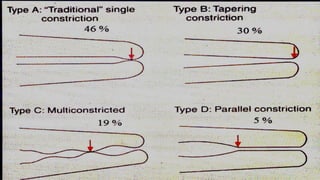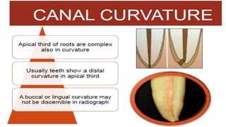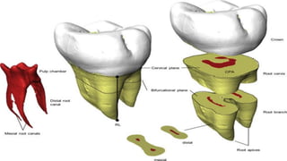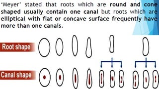 The document discusses the anatomy of root canals and classifications of root canal morphologies. It introduces several past classification systems from Weine, Vertucci, and others. However, it notes that these systems are unable to categorize all the diversity seen in root canal configurations based on more recent anatomical studies using micro-CT technology. A new simplified classification system is needed that can be adopted universally to better describe the complex variations in root and root canal anatomy.