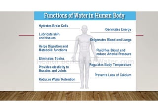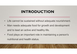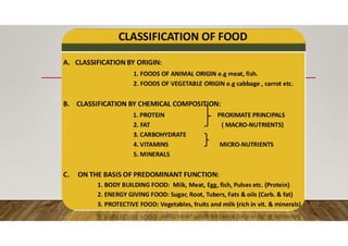 The document is a presentation by Dr. Kumkum Pandey on food and nutrition, outlining the classification and functions of food and the importance of nutrition for growth, health, and disease prevention. It defines food as essential for survival and categorizes it by origin (animal or plant) and function (energy-yielding, body-building, protective, and regulatory). Key nutrients discussed include carbohydrates, proteins, fats, vitamins, minerals, and water, highlighting their roles in energy production, bodily functions, and overall health.