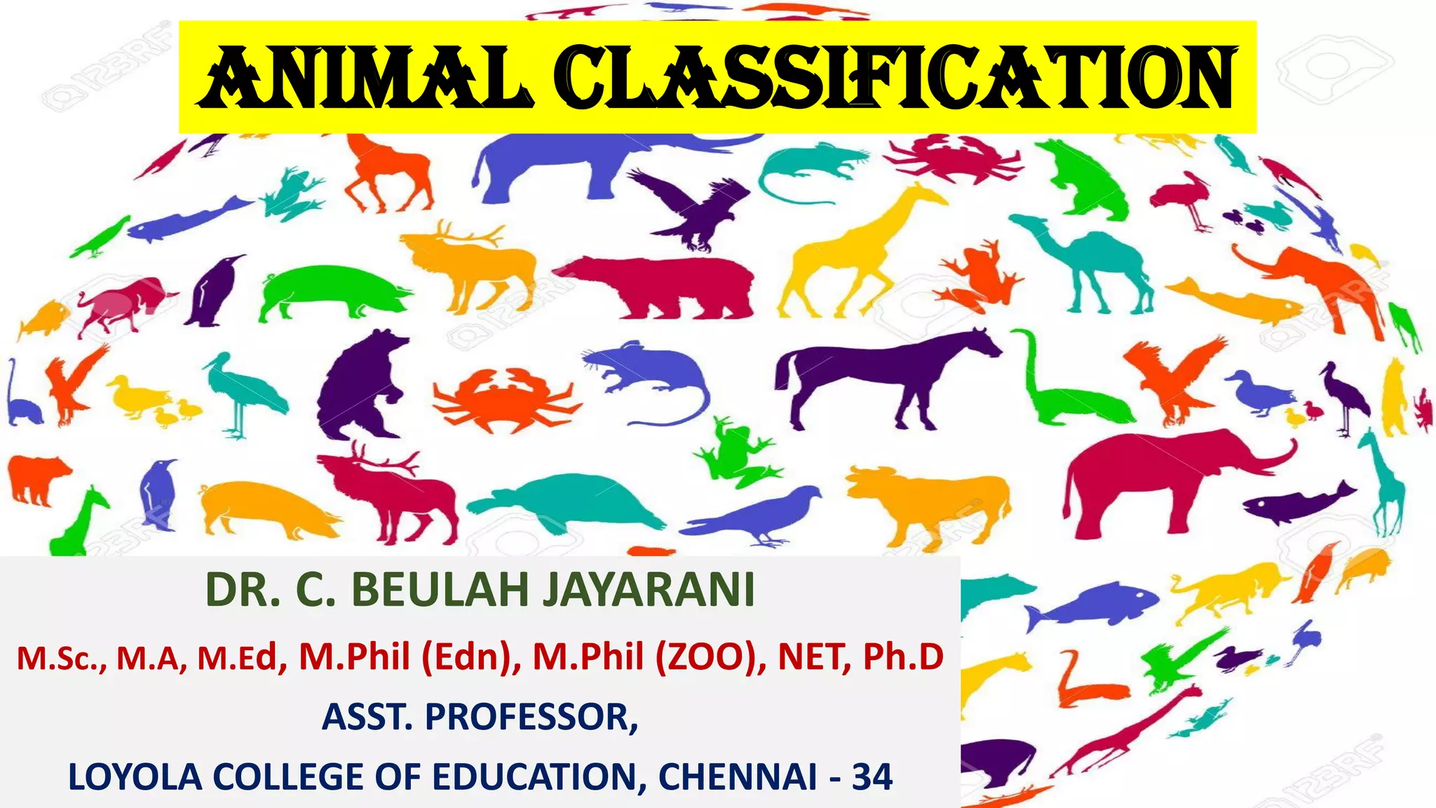 The document outlines the principles of animal classification, explaining its importance in understanding biological diversity and identifying organisms based on observable traits and evolutionary relationships. It covers criteria for classification, including germ layers, body plan, symmetry, body cavity, segmentation, and support, while also discussing historical classification methods and the taxonomic hierarchy. Various animal phyla and their characteristics are described, illustrating the complexity and diversity within the animal kingdom.