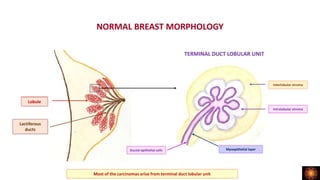 1. Breast carcinomas most often arise from the terminal duct lobular unit and can be benign or malignant lesions that are either in situ or invasive.