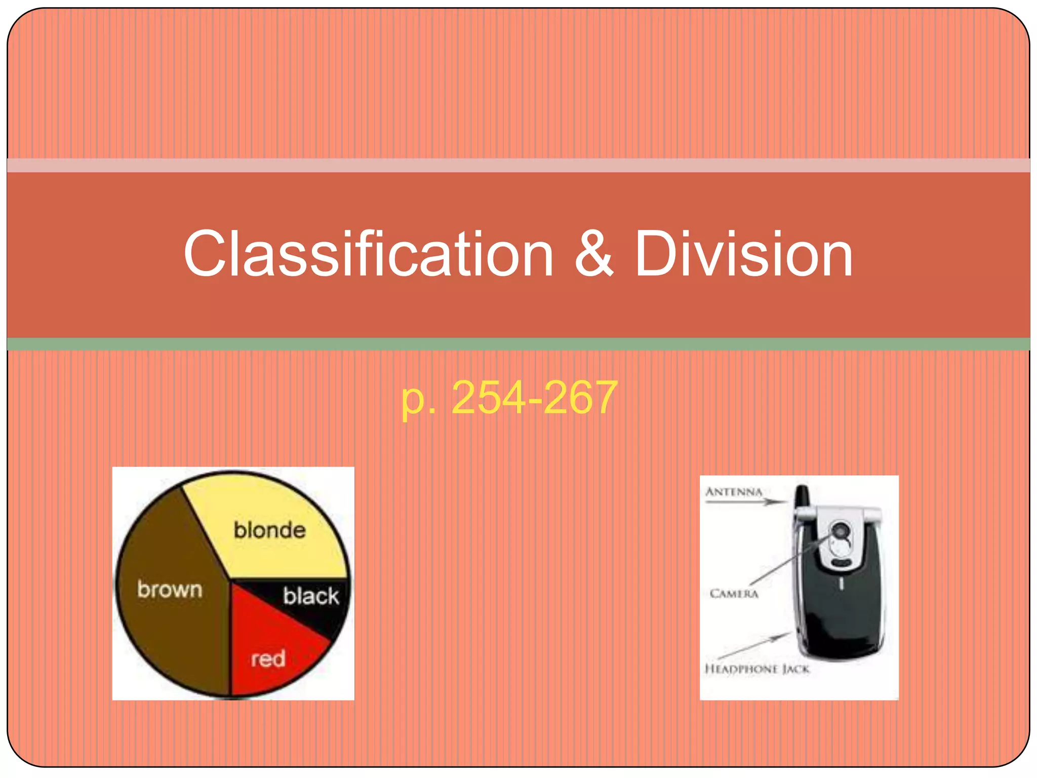 This document provides information about classification and division essays. It discusses how classification essays group items according to their characteristics and division essays break down a single item into its components. Both patterns can be used separately but are often combined. The document also provides examples of how classification makes study easier and provides a fresh perspective, while division can help explain something not well understood. It notes that a classification must group elements according to some principle, while division does not always need a principle. Finally, it assigns a classification/division essay due on November 20th and provides the topic and instructions for completion.