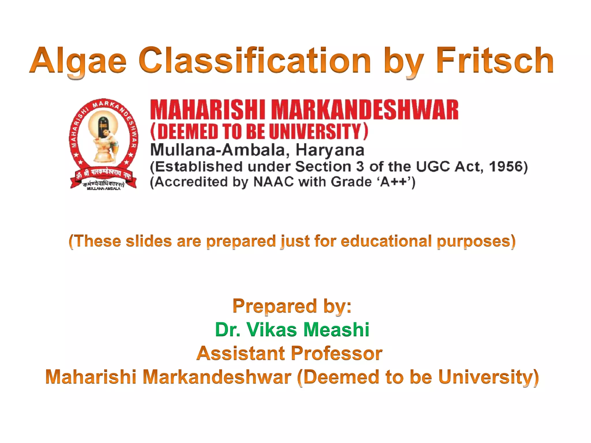 Dr. Vikas Meashi summarized Fritsch's 1945 book that classified algae into 11 classes based on pigments, food storage, reproduction type, motility, and flagella. The classes included Chlorophyceae, Xanthophyceae, Chrysophyceae, Bacillariophyceae, Cryptophyceae, Dinophyceae, Chloromonadineae, Euglenineae, Phaeophyceae, Rhodophyceae, and Myxophyceae. Examples were provided for each class.