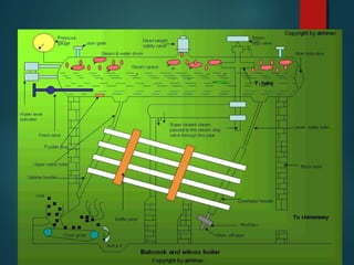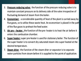 The document provides a comprehensive overview of steam power plant engineering, detailing the layout, types of boilers (such as fire tube, water tube, high pressure, and low pressure), and essential boiler mountings for safe operation. It discusses various boiler systems, including fluidized bed combustion technologies, their operational principles, and advantages over conventional systems. Additionally, it covers the design and functioning of condensers in steam power plants.