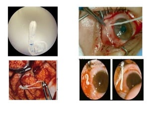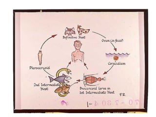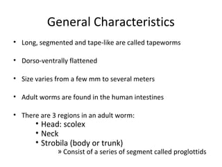 Tapeworms are flat, segmented parasitic worms that infect the intestines. There are two main types: pseudophyllideans and cyclophyllideans. Pseudophyllideans like Diphyllobothrium latum (the fish tapeworm) have two slit-like grooves and develop through two intermediate hosts. Cyclophyllideans like Taenia saginata have four cup-like suckers and do not require intermediate hosts. Symptoms of infection depend on the tapeworm species and location. Diagnosis involves finding eggs or proglottid segments in stool or removing the worm surgically.