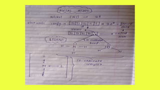 Complexes are formed when ligands bond to a central metal atom through coordinate covalent bonds. Coordination complexes result from a Lewis acid-base reaction between ligands, which donate electron pairs, and metal ions, which accept them. There are several types of complexes including inorganic complexes based on primary and secondary valency and coordination number, and organic complexes such as chelates, charge transfer complexes, and inclusion complexes where one molecule is trapped within the crystal structure of another. Coordination complexes feature a central metal ion surrounded by ligands in a fixed coordination number.