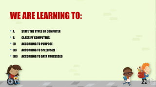 There are three main ways to classify computers: by purpose, data processed, and size/speed. By purpose, there are general purpose computers designed for a variety of tasks and special purpose computers designed for a single task. By data processed, there are analog computers that measure data, digital computers that use binary, and hybrid computers that can do both. By size/speed, there are supercomputers that are the largest and fastest, mainframes for large organizations, mini computers for medium-sized uses, and microcomputers for personal use.