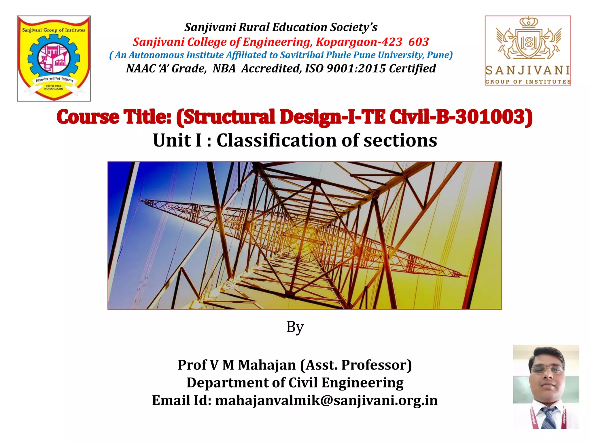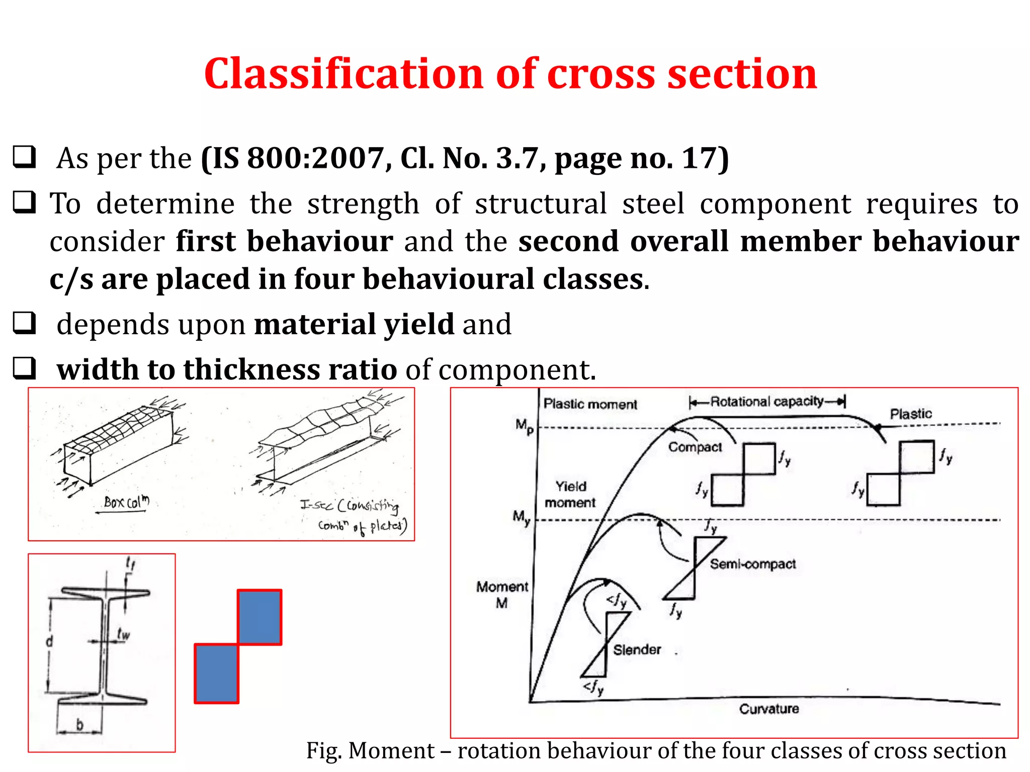 This document discusses the classification of steel cross sections according to Indian Standard IS 800:2007. It explains that cross sections are classified into four classes - plastic, compact, semi-compact, and slender - based on their width-thickness ratio and ability to develop plastic hinges and plastic moment capacity. Formulas and limiting ratios for each class are provided. Three example cross sections are then classified - a ISHB 400 section is compact, a ISMC 300 section is plastic, and a ISA 150X150X12 angle section is semi-compact.