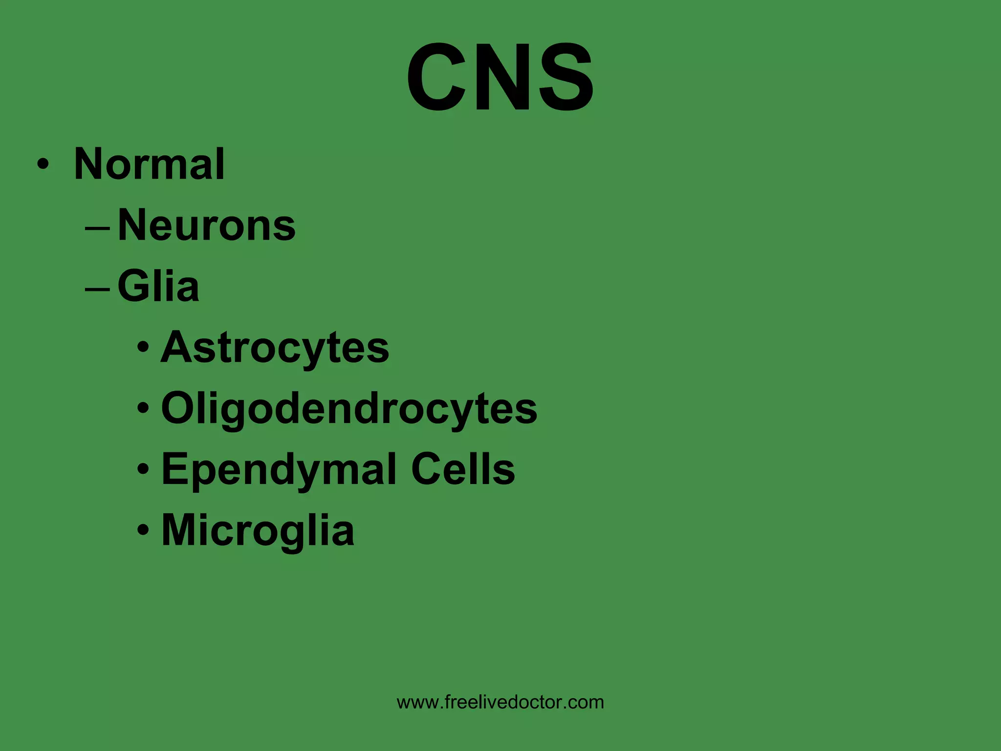 The document provides an overview of various cellular reactions, disease patterns, malformations, injuries, and degenerative conditions that can affect the central nervous system (CNS). It discusses the different cell types of the CNS, including neurons, glia and their roles. Common CNS disease patterns are described as degenerative, inflammatory, neoplastic and traumatic. Specific CNS diseases, injuries, infections, malformations and degenerative conditions are then outlined in detail with their characteristic clinical and pathological features.
