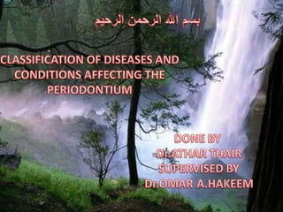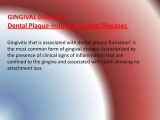 This document summarizes various gingival and periodontal diseases. It describes diseases caused by dental plaque, such as gingivitis, and modified by factors like medications, malnutrition, and systemic diseases. It also discusses periodontitis and other conditions like necrotizing gingivitis/periodontitis, endo-perio lesions, and developmental deformities that can affect the gingiva and periodontium. Diagnostic methods and typical treatments are mentioned for several conditions.