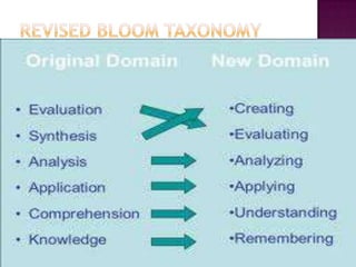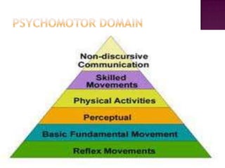 The document discusses the classification of educational objectives into three domains: cognitive, affective, and psychomotor. It provides detailed descriptions and examples of levels within the cognitive domain, including knowledge, comprehension, application, analysis, synthesis, and evaluation. Sub-categories and action verbs are provided for each level. The document also discusses objectives related to the affective and psychomotor domains.
