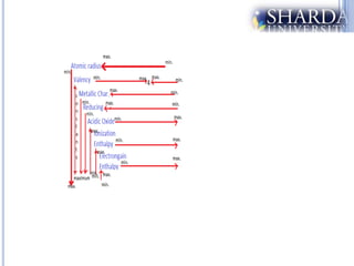 The document discusses periodic trends in properties such as atomic radius, ionization energy, and electronegativity. It explains Mendeleev's periodic table and how modern periodic law arranges elements based on atomic number instead of atomic mass. Periodicity in properties occurs because similar electronic configurations repeat at regular intervals as atomic number increases. Atomic radius generally decreases across a period as nuclear charge increases, and increases down a group as more shells are added. Ionization energy is the energy required to remove an electron from an atom, and is directly proportional to nuclear charge and inversely proportional to size and shielding effects.