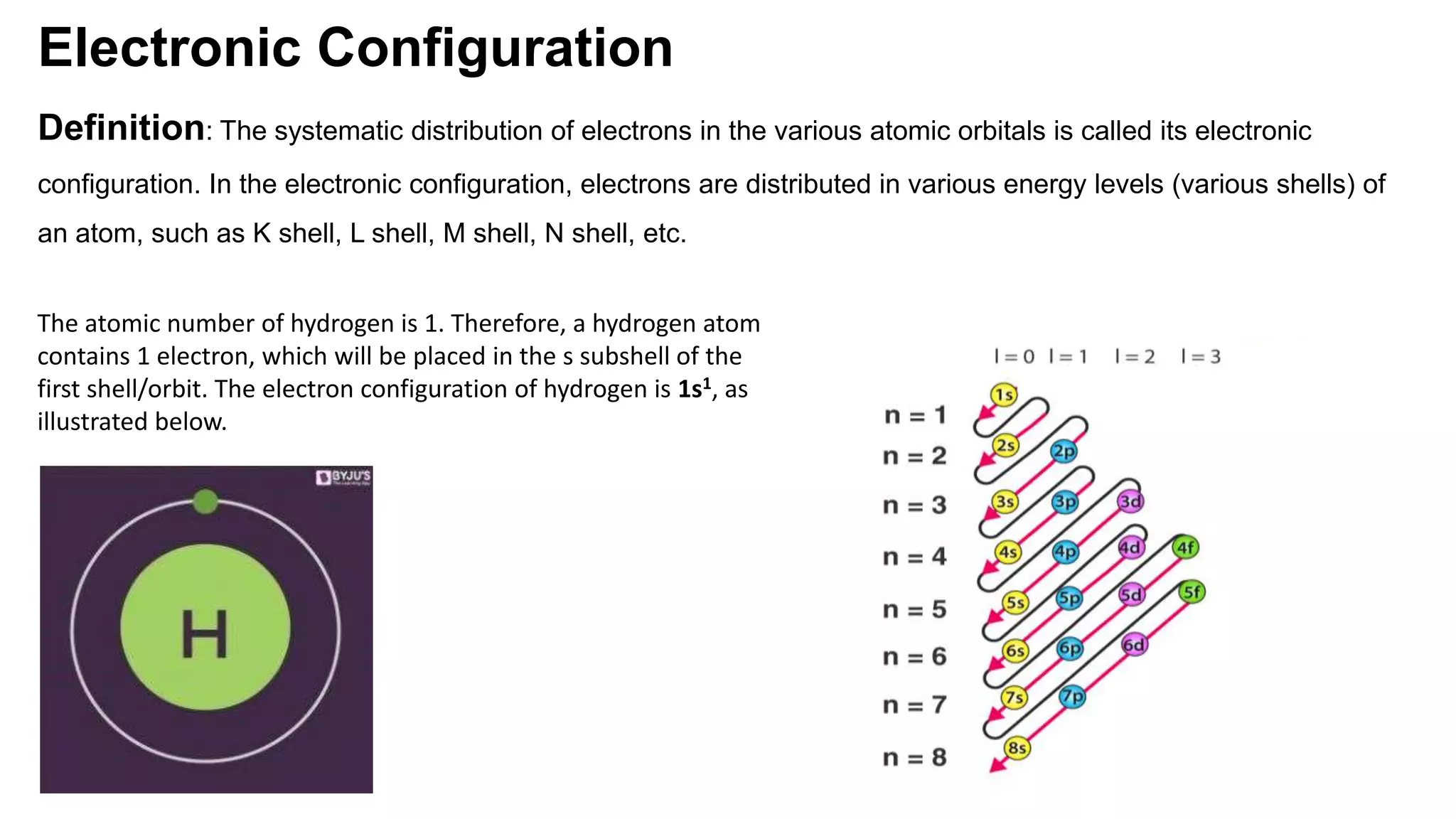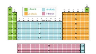 The document discusses electronic configuration and periodic trends. It defines electronic configuration as the distribution of electrons in atomic orbitals. It then provides examples of the electronic configurations of hydrogen, oxygen, and chlorine. It also summarizes that properties like atomic radius, ionization energy, and electronegativity follow trends across periods and down groups as a result of electronic configuration.