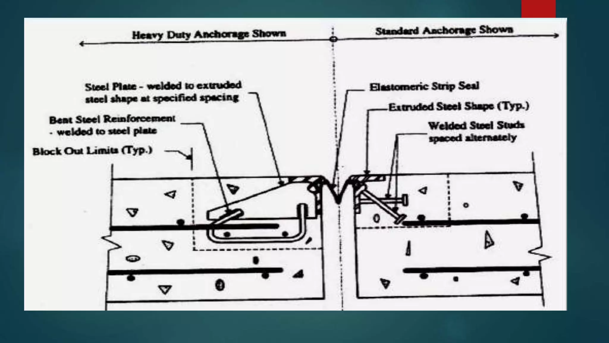 This document summarizes the different types of expansion joints used in bridges based on the amount of movement they can accommodate. It discusses small movement joints that allow up to 45mm of movement, including compression seal, silicone sealant, and asphalt plug joints. Medium movement joints that allow 45-130mm are described, such as sliding plate, strip seal, and finger plate joints. Large movement joints that accommodate over 130mm of movement are also summarized, specifically modular bridge expansion joints.