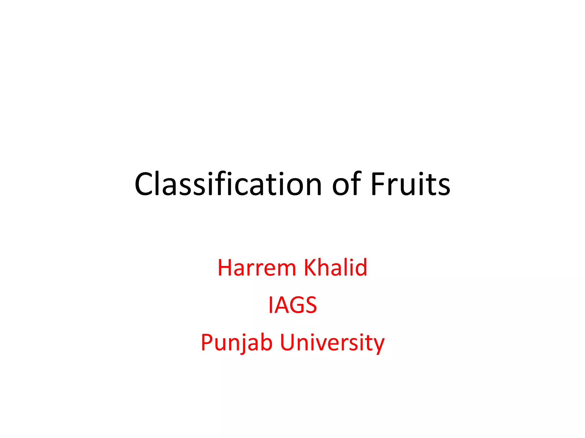 This document provides classifications for various fruits including their botanical characteristics, climate requirements, soil preferences, and other growth factors. It discusses that apples, apricots, avocados, and many other fruits listed are dicots from temperate or tropical regions. They have characteristics like being climacteric or non-climacteric, tolerances to shade, drought, and salt stress, preferred soil pH levels, longevity, and fruit sizes. The classifications cover botanical families, plant structures, flowering habits and more for each fruit.