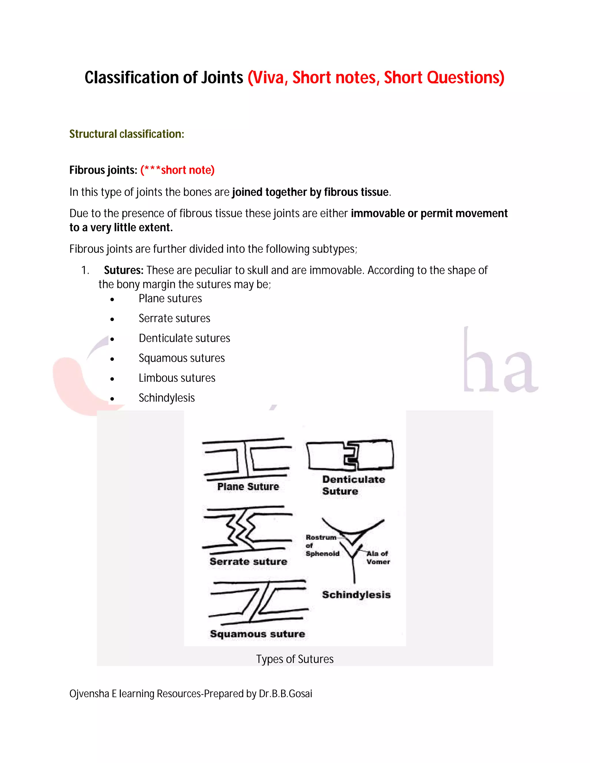 The document discusses the classification of joints, including fibrous, cartilaginous, and synovial joints, detailing their structure and subtypes. It describes immovable, partially moveable, and freely moveable joints, along with the features and types of synovial joints. Examples of each joint type and their movements are provided for clarity.