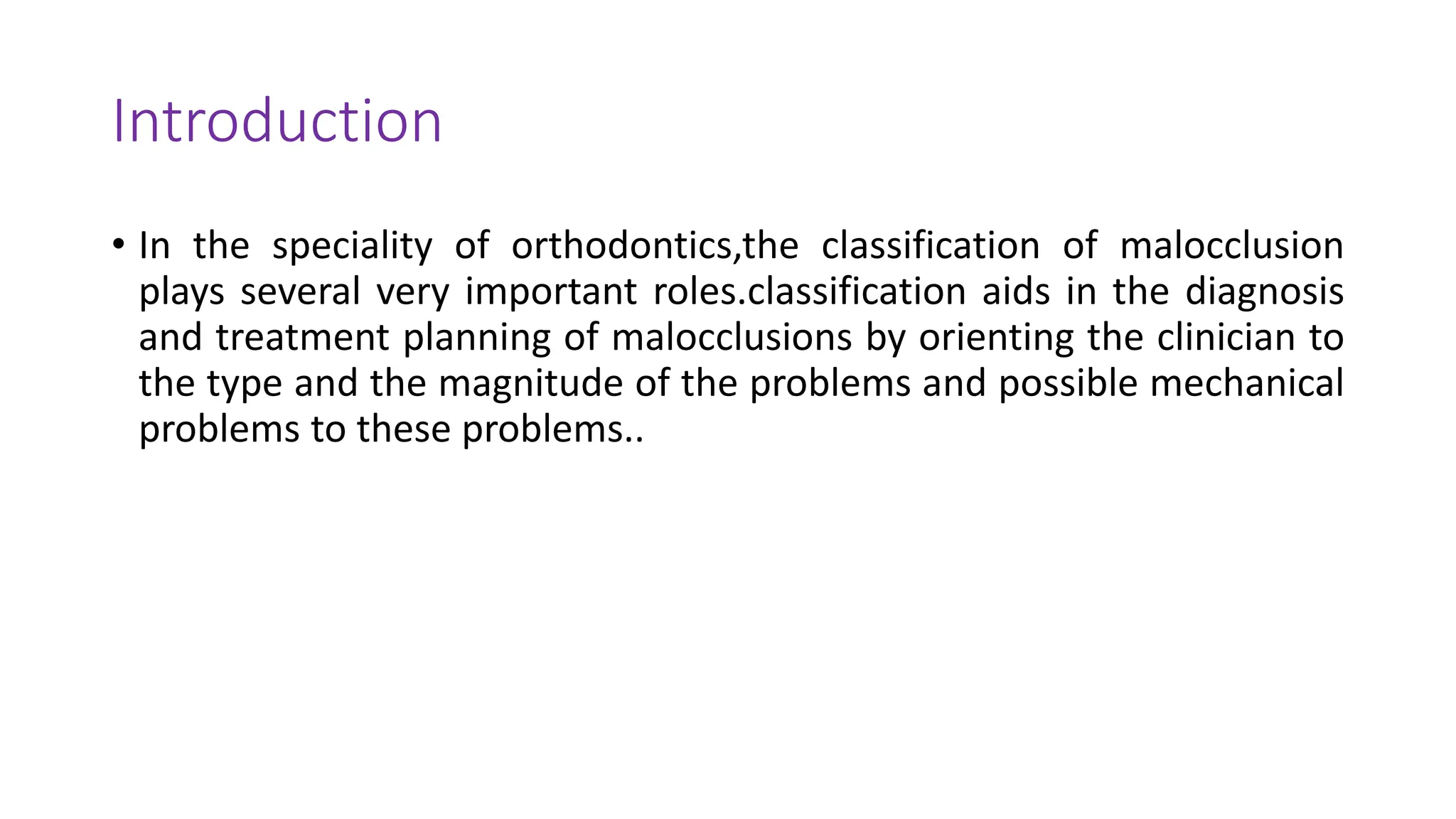 The document discusses the classification of malocclusion in orthodontics, which is critical for diagnosing and planning treatment by identifying the types of dental issues. Various classification systems are explored, including Angle's classification and its modifications, as well as other systems like Dewey's and Ackerman-Profit's, each with their own advantages and limitations. Understanding these classifications is essential for orthodontists to create effective treatment plans.