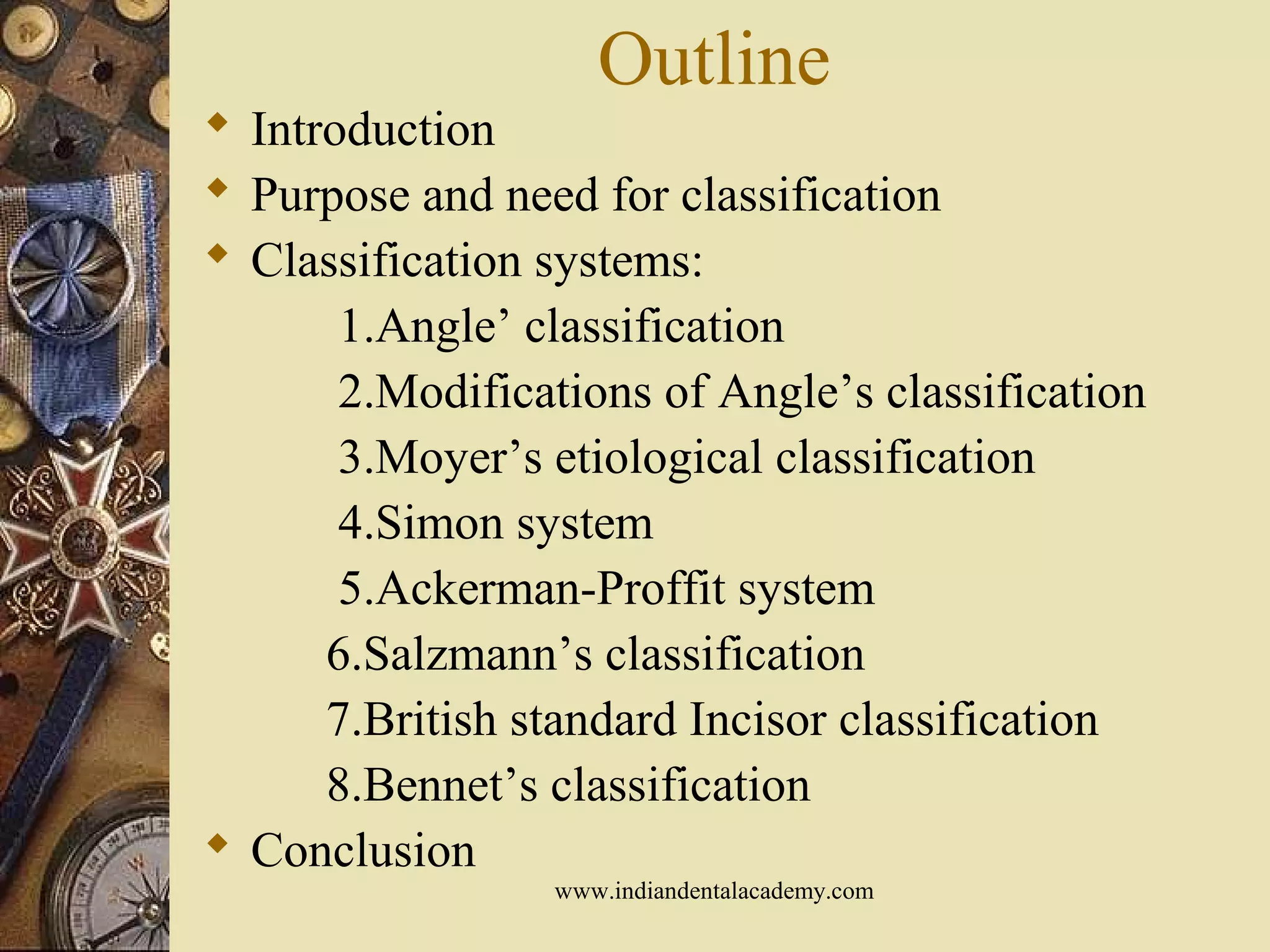 The document discusses various classification systems for malocclusion, primarily focusing on Angle's classification, which categorizes malocclusions into Class I, Class II, and Class III based on the relationship of the first molars. It outlines the purpose and need for classification, advantages and disadvantages of the systems, along with several modifications and alternative classifications, emphasizing their significance in orthodontics. The document concludes by addressing the need for precise goals in orthodontic treatment and discusses Moyer's etiologic classification based on tissue origin.
