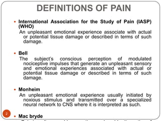 This document discusses classifications of pain. It defines pain according to several organizations and researchers. It notes the historical understanding of pain from Greek, Latin, and early philosophers' perspectives. It then describes types of pain based on speed of onset and duration, including experimental, transient, acute, and chronic pain. It also discusses types based on stimulation level, including somatic and visceral pain. The document outlines specific pains such as headaches, toothaches, and trigeminal neuralgia. It concludes by defining abnormal pains including hyperalgesia, allodynia, hyperpathia, and phantom limb pain.