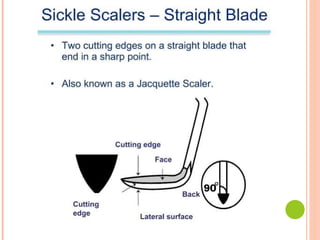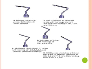 The document details the classification and functions of periodontal instruments used in dentistry, focusing on their specific purposes for scaling, curettage, and probing. It describes various types of instruments, including periodontal probes, explorers, scaling instruments, and ultrasonic devices, along with their designs and intended uses. Additionally, it covers advanced technologies such as digital probes and ultrasonic scalers, enhancing the diagnosis and treatment of periodontal disease.