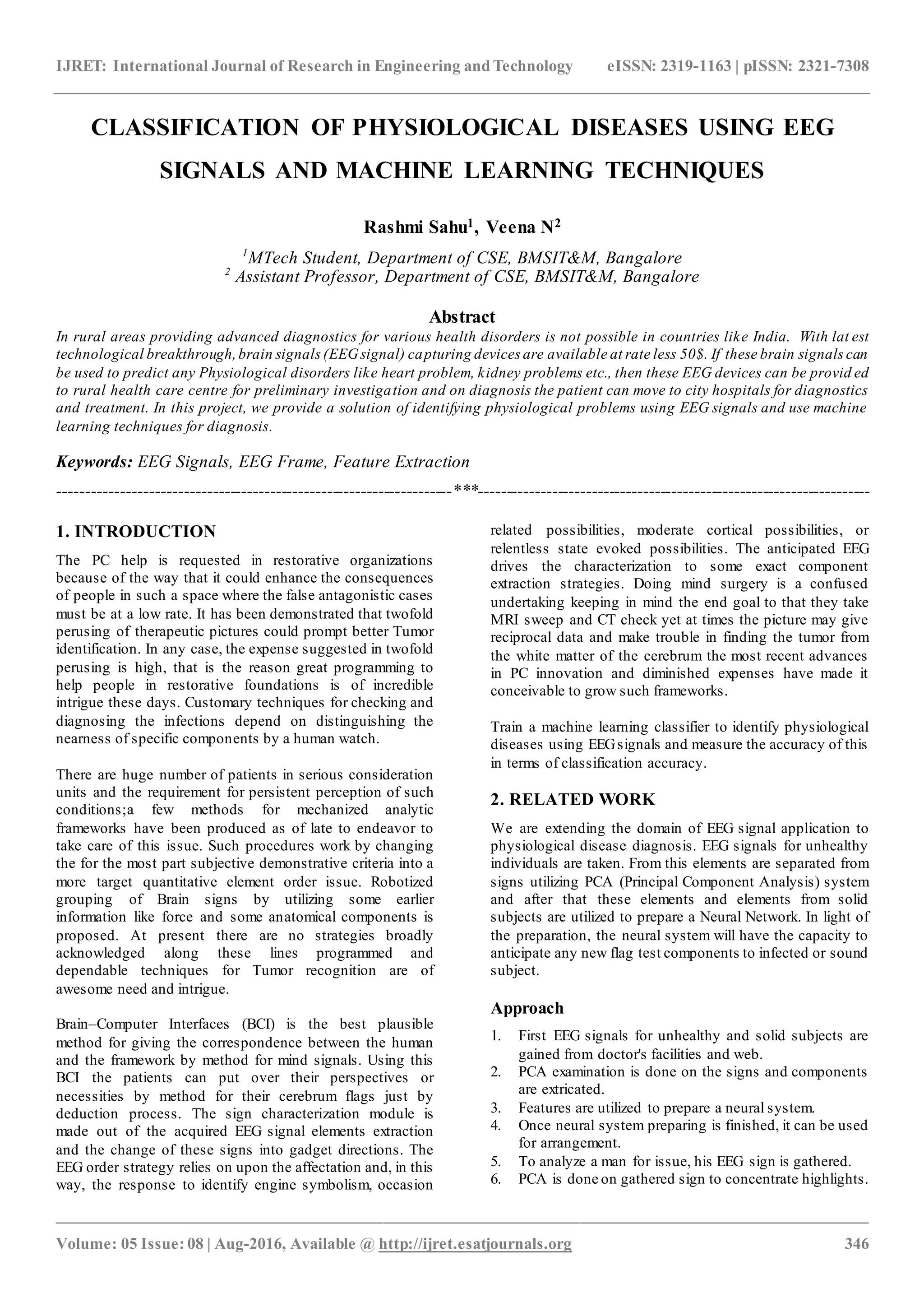 The document discusses a project aimed at using EEG signals and machine learning techniques to classify physiological diseases, particularly for use in rural healthcare settings in India. It describes a methodology for extracting features from EEG signals to train a neural network for disease diagnosis, emphasizing cost-effectiveness and ease of use. The conclusion notes that the implemented system improves classification accuracy for identifying conditions such as tumors and epilepsy.