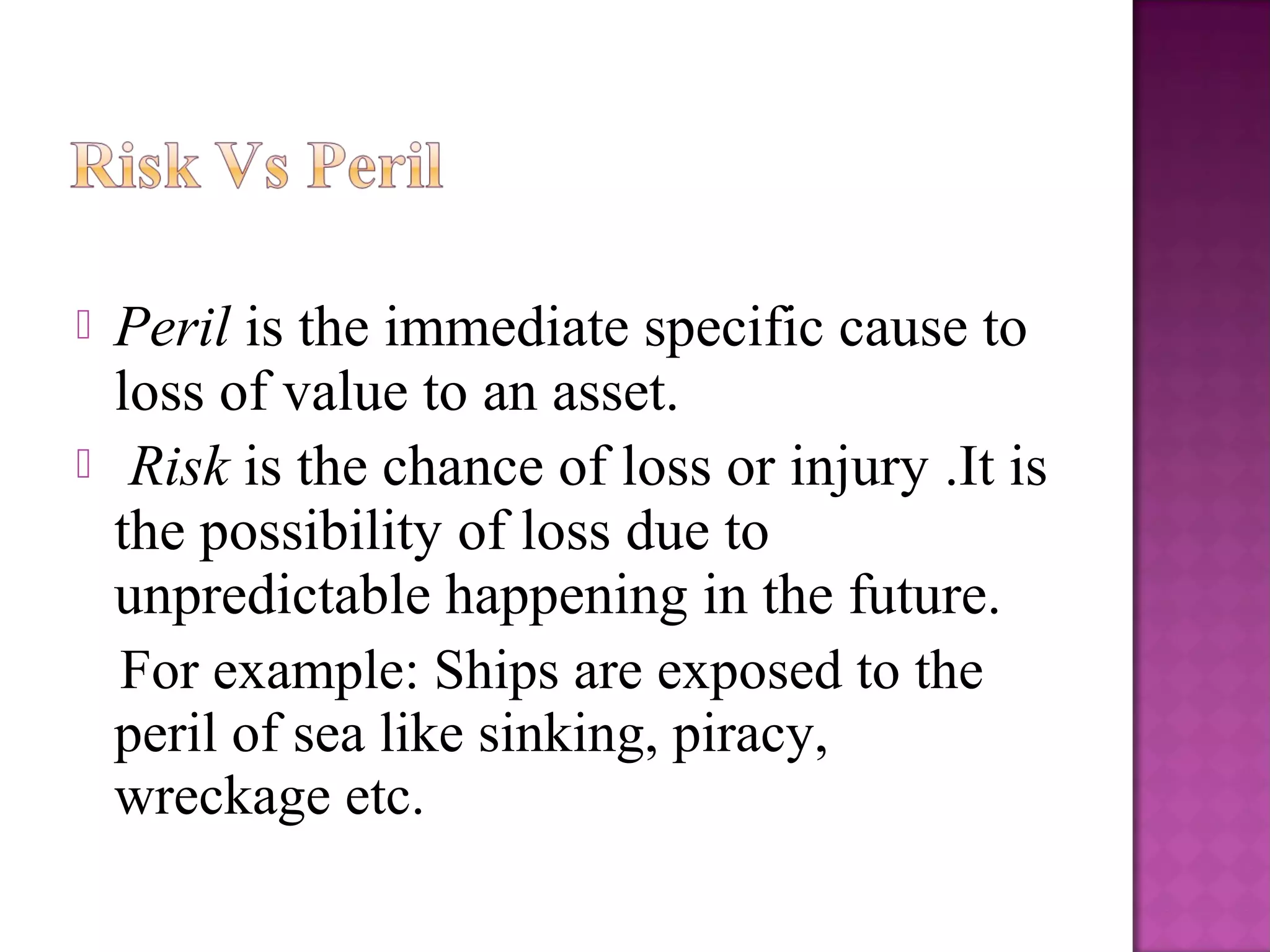 The document discusses the key differences between risk and peril, and defines various types of risks such as financial vs non-financial, quantifiable vs non-quantifiable, fundamental vs particular, pure vs speculative, and dynamic vs static risks. It also explains the differences between insurance, gambling, and wagering contracts. Insurance involves scientifically calculating risks and premiums based on probability, while gambling and wagers involve uncontrolled events with the goal of profit rather than risk sharing. Finally, it discusses the differences between insurance and assurance, noting that assurance guarantees payment on an event that is sure to happen, like death in a life insurance policy.