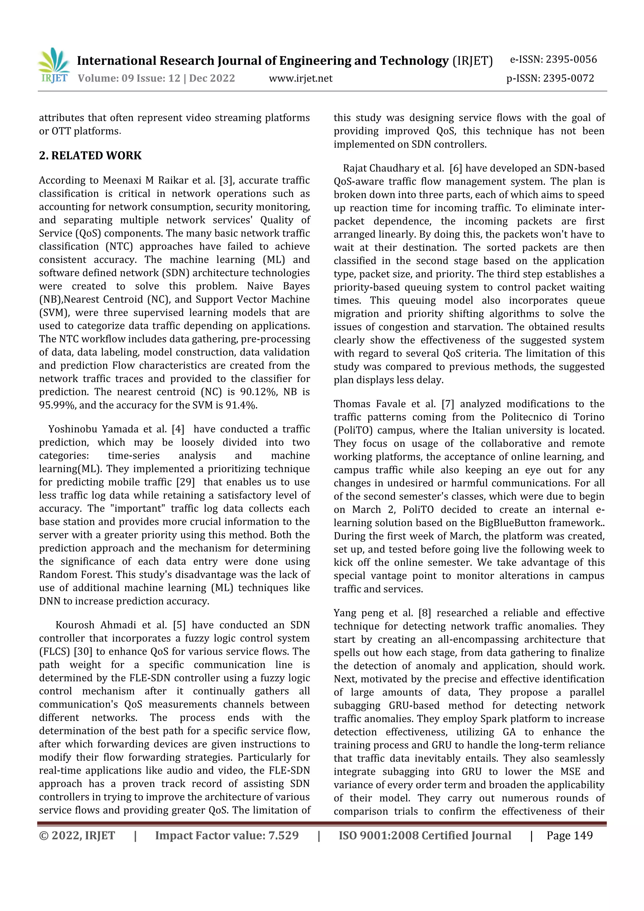 This document discusses classifying network traffic using machine learning to provide quality of service in software defined networks. It aims to classify traffic by application to prioritize user required traffic and restrict unnecessary traffic like from over-the-top platforms to improve quality of service. The document reviews several related works applying techniques like naive bayes, support vector machines, and fuzzy logic for traffic classification and management in software defined networks to improve quality of service metrics.