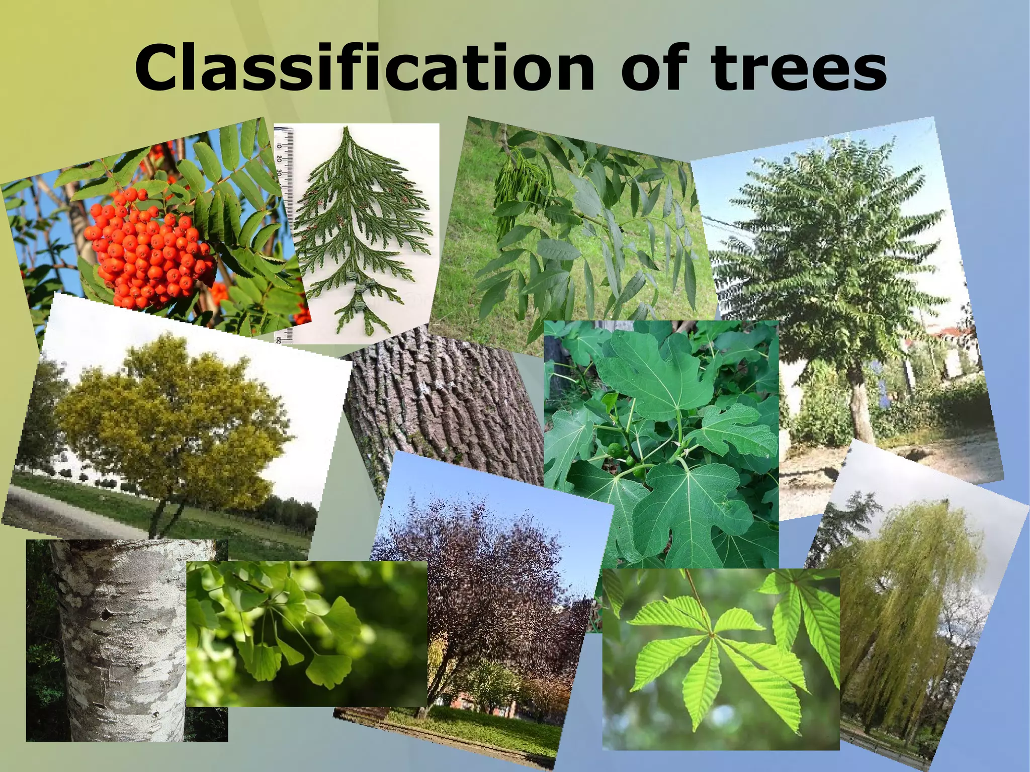 This document provides a classification of trees based on their leaf characteristics. It divides trees into two main categories: conifers and broadleaved trees. Conifers generally have needle-like or scale-like leaves and reproduce via cones rather than flowers. Broadleaved trees can have compound, simple lobed, or simple unlobed leaves. The document then further categorizes and describes numerous tree species based on attributes of their leaves such as shape, margin, texture, and whether they are deciduous or evergreen.