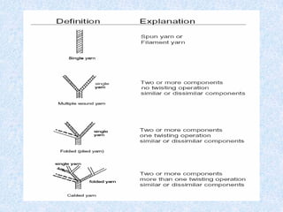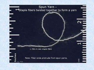 1. Yarn twist : Yarns (especially spun yarns) are twisted to hold the fibres together.