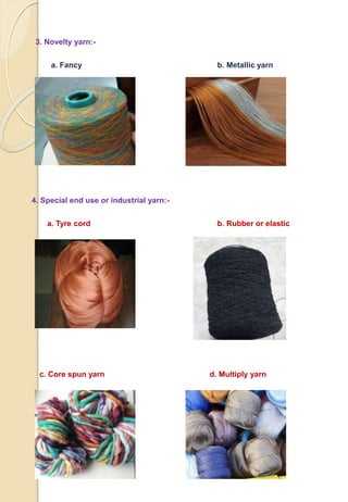 This document classifies yarns into several categories: by staple fiber type (carded, combed, worsted, woolen), by continuous filament type (natural, synthetic), as novelty yarns (fancy, metallic), for special end uses (tire cord, rubber/elastic, core spun, multiply, coated), as high bulk yarns (staple, continuous filament), and as stretch yarns (twist, crimp, knit, stretch under tension). It also provides a flow chart showing the process of making carded yarn from staple fibers through winding onto cones and heat setting.