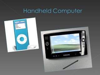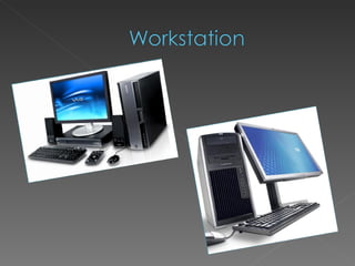 This document lists various hardware and software components that make up different types of computing devices. It includes both internal components like central processing units, RAM, and system software as well as external components like keyboards, mice, monitors, and printers. The document also lists several general categories of computing devices including personal computers, workstations, game consoles, servers, clients, mainframes, and smartphones.